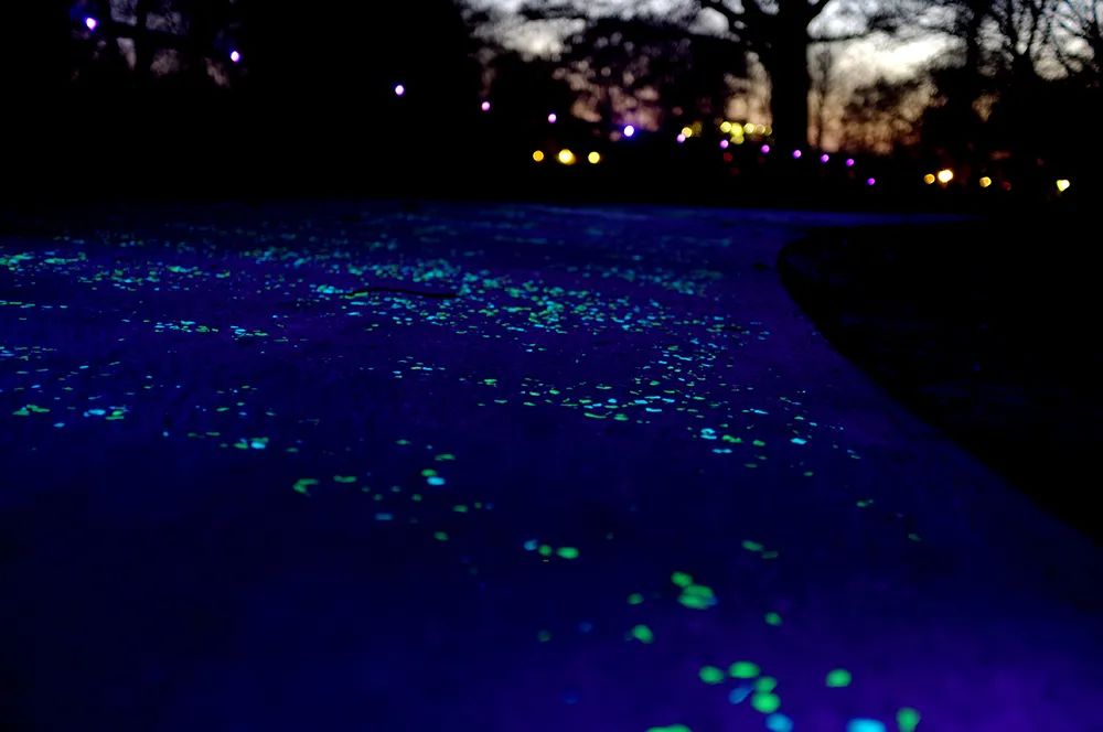 在路燈無法覆蓋的道路使用方面,埃因霍溫也做了很多嘗試,最著名的莫過于「梵高車道」。路面上鋪設(shè)的特制石子,能在白天吸收光能,并儲存能量;夜晚發(fā)光,為行人引路,形成一套自給自足的照明系統(tǒng)。