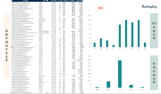 從平臺分布來看,確實是比較多。總體平臺數量有50來個,區縣級普遍超過3個,級別高度下沉。從外評來看,集中在AA;從YY評級來看,在7、7-、8+和8這四檔,有點厚尾,顯著右偏,投機級占比比較高,平臺確實是需要一定的整合。