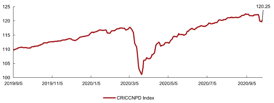 為了更好地展示房企融資的市場表現(xiàn),克而瑞委托倫敦證券交易所集團(LSEG)的全資子公司:富時羅素經(jīng)過嚴(yán)格篩選,挑選出具有代表性的中資房地產(chǎn)美元債進行編制了克而瑞中國地產(chǎn)債券領(lǐng)先指數(shù)。截止至2020年9月29日,該指數(shù)相比9月21日高點小幅回調(diào)至120.05,中資地產(chǎn)美元債在一季度疫情后,隨著二季度的復(fù)工復(fù)產(chǎn),房地產(chǎn)行業(yè)快速復(fù)蘇,美元債的市場表現(xiàn)也有明顯的回彈,近期呈現(xiàn)穩(wěn)健上行的態(tài)勢。