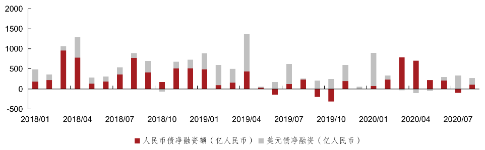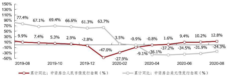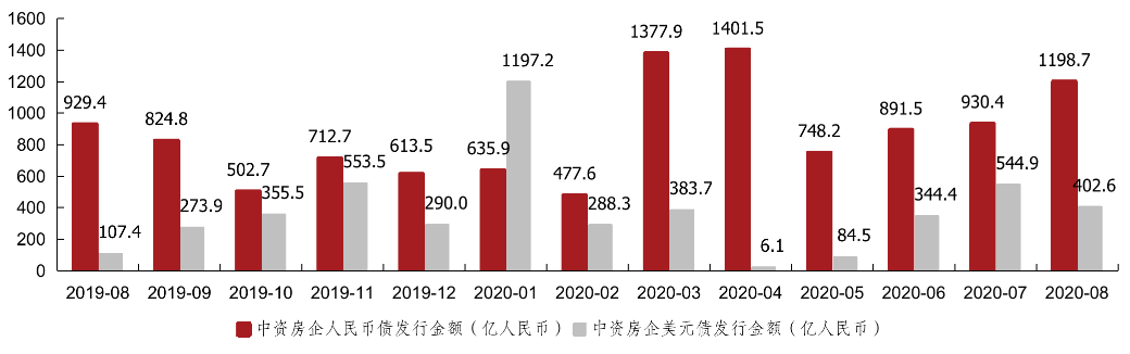 2020年8月,中資房企美元債發(fā)行金額為58.1億美元,相當(dāng)于402.6億元人民幣,同比上升274.7%,環(huán)比下降26.1%;人民幣債發(fā)行金額為1198.7億人民幣,同比上升29.0%、環(huán)比上升28.8%。