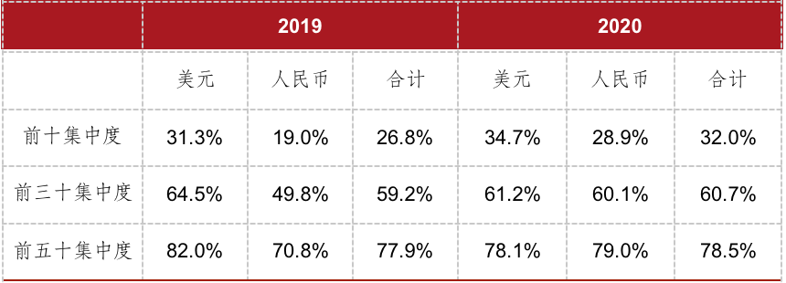 2020年前8月,前十發(fā)債集中度提升,人民幣債加權(quán)票息下降明顯。與銷售業(yè)績集中度提升的方向一致,資金向頭部房企集中以規(guī)避中小房企在調(diào)控中存在的各類不確定性風(fēng)險。