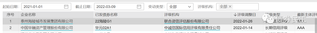 根據wind資訊的統計數據,2022年1月1日至3月9日,國內信用債券市場上債券發行人評級正面變動的只有兩例。其中,華融資產為評級負面調整為正面,主體信用等級調升的只有泰州海陵城市發展集團有限公司,主體信用等級由AA調升至AA+。