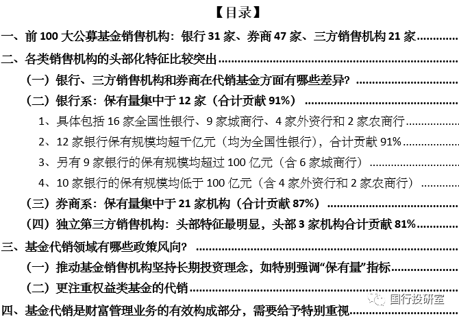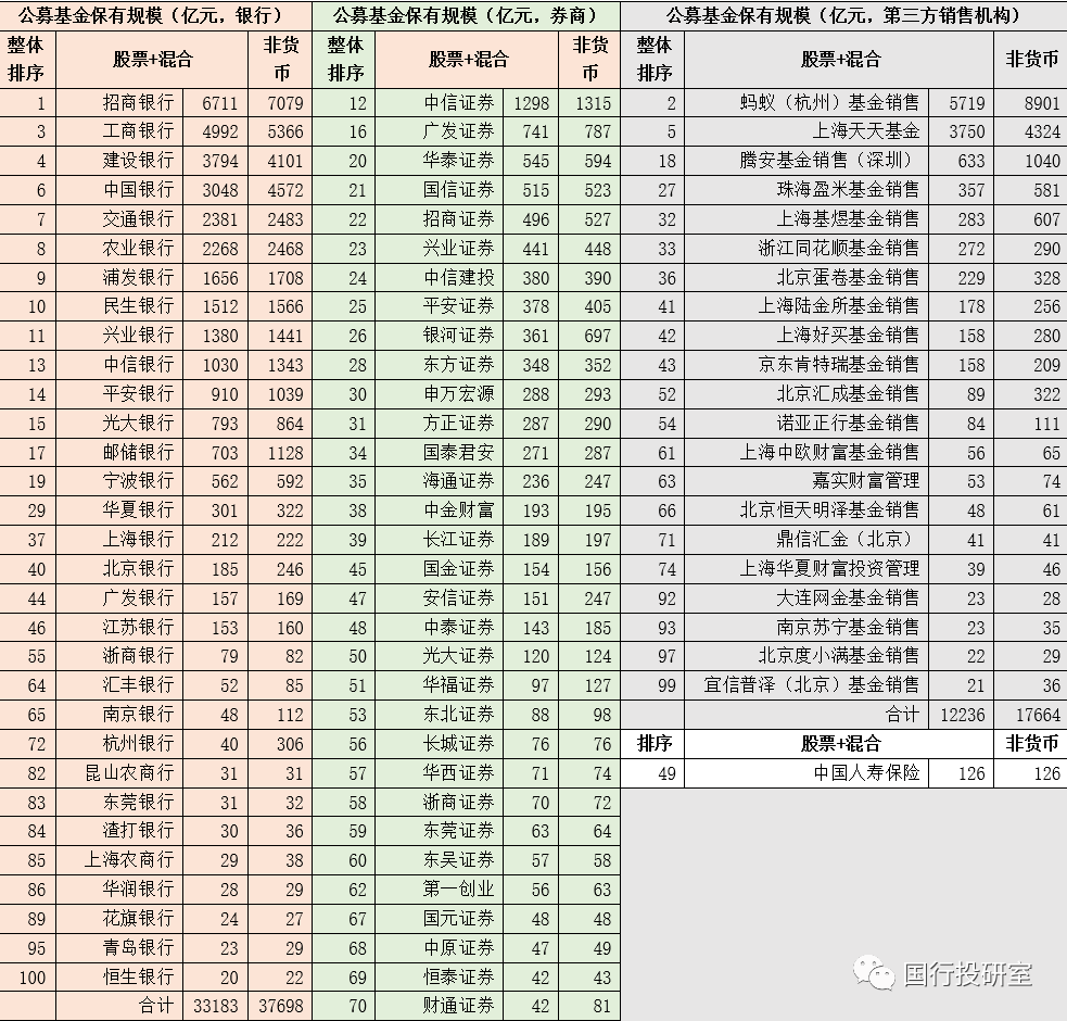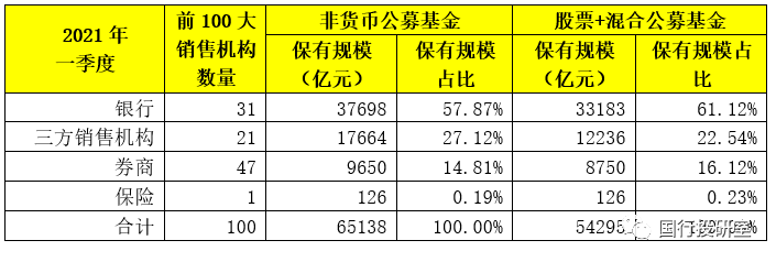 一、前100大公募基金銷售機構(gòu):銀行31家、券商47家、三方銷售機構(gòu)21家