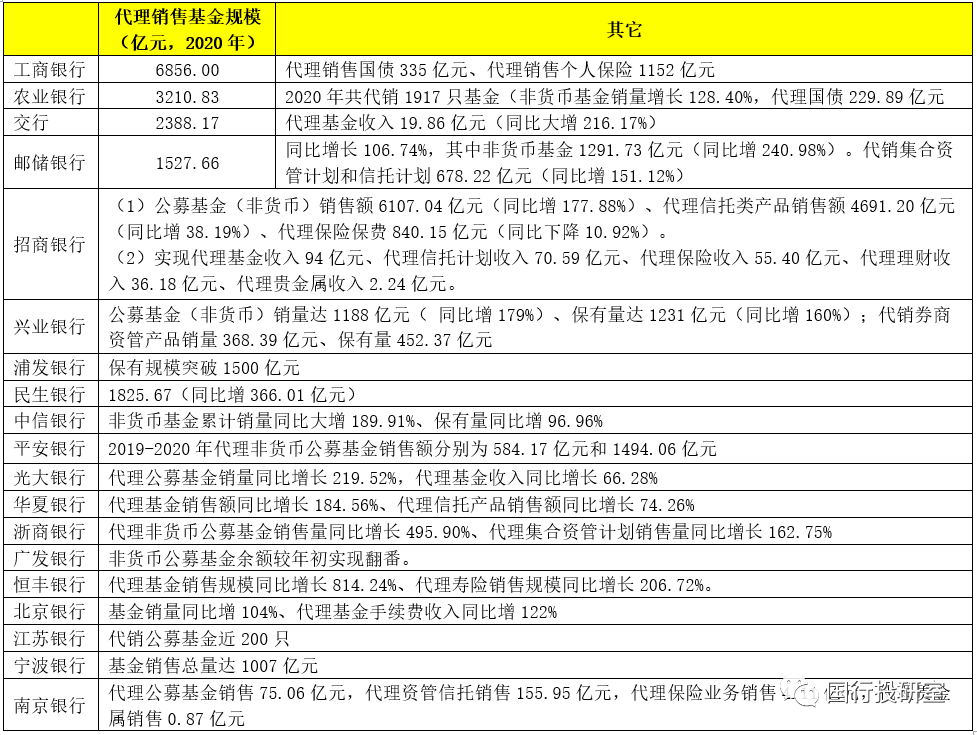 基金代銷、自營理財以及代銷資管計劃、信托計劃、保險等均是財富管理業(yè)務的有效組成部分,而基金代銷尤為受到重視,這主要和近兩年公募基金規(guī)模大幅增長有關(guān)(如截至2021年5月20日,非貨幣公募基金的規(guī)模已增至12.84萬億,2018-2020年底分別為4.76萬億、7.29萬億和12.01萬億)。同時基金代銷業(yè)務亦相當于銀行的個人客戶提供了投資權(quán)益類資產(chǎn)、涉足資本市場的有效渠道。
