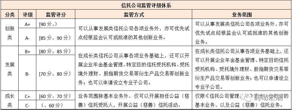 第三,信托公司的監(jiān)管評(píng)級(jí)主要分為創(chuàng)新類(lèi)、發(fā)展類(lèi)和成長(zhǎng)類(lèi)三個(gè)大類(lèi),并進(jìn)一步按照A、B、C分為六檔,通常情況下只有評(píng)級(jí)結(jié)果在B-及以上的信托公司才能稱(chēng)之為良好。