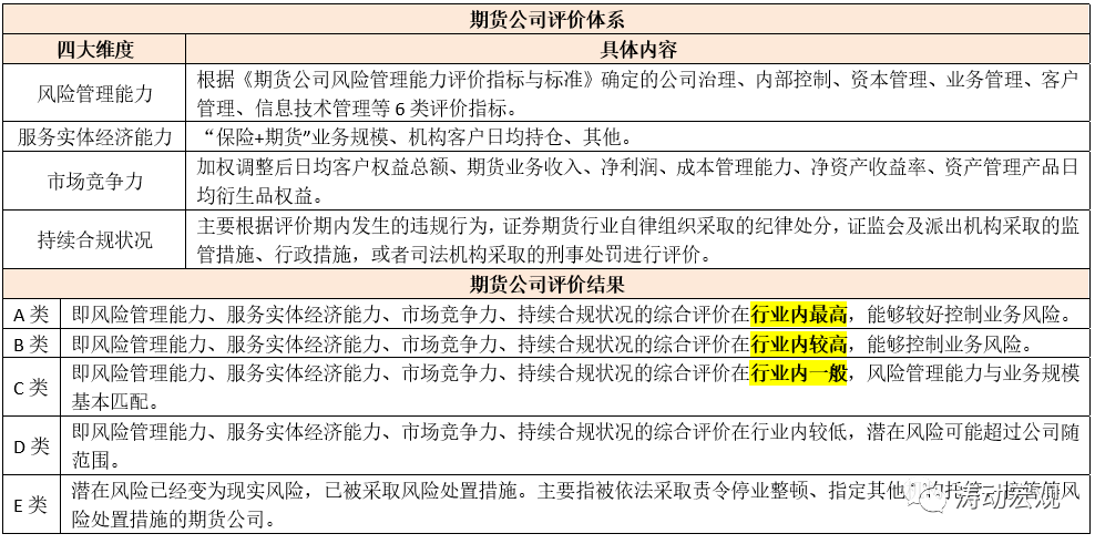 2、證監(jiān)會(huì)主要根據(jù)2019年2月15日修訂的《期貨公司分類(lèi)監(jiān)管規(guī)定》(證監(jiān)會(huì)(2019)第5號(hào)公告),對(duì)期貨公司進(jìn)行評(píng)級(jí),事實(shí)上這一文件最早于2011年4月12日公布。同時(shí),期貨公司的評(píng)價(jià)標(biāo)準(zhǔn)仍以風(fēng)險(xiǎn)管理與控制能力為基礎(chǔ),主要依據(jù)《期貨公司風(fēng)險(xiǎn)管理能力評(píng)價(jià)指標(biāo)與標(biāo)準(zhǔn)》。