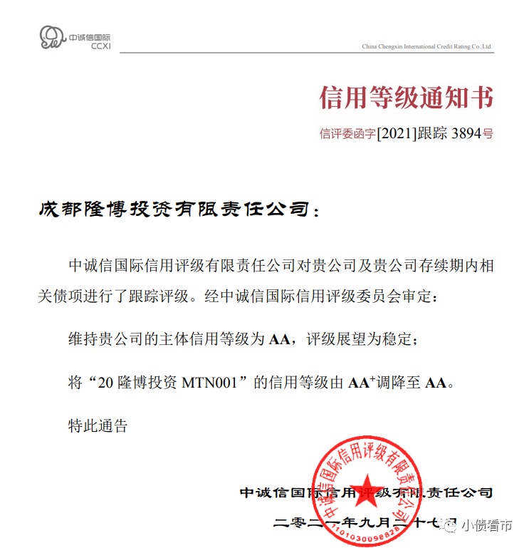 9月28日,中誠信國際公告稱,維持成都隆博投資有限責任公司(以下簡稱“隆博投資”)的主體信用等級為AA,評級展望為穩定,將“20隆博投資MTN001”的信用等級由AA+調降至AA。