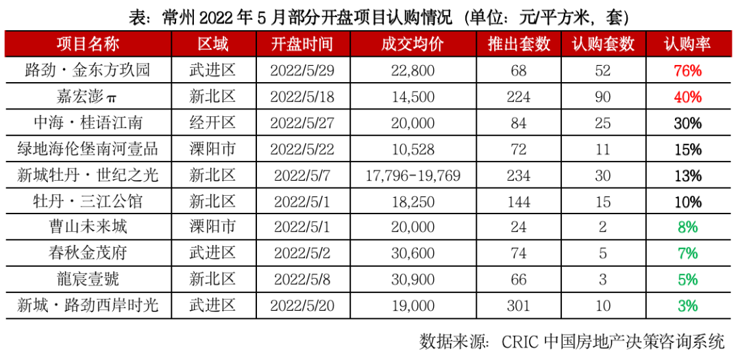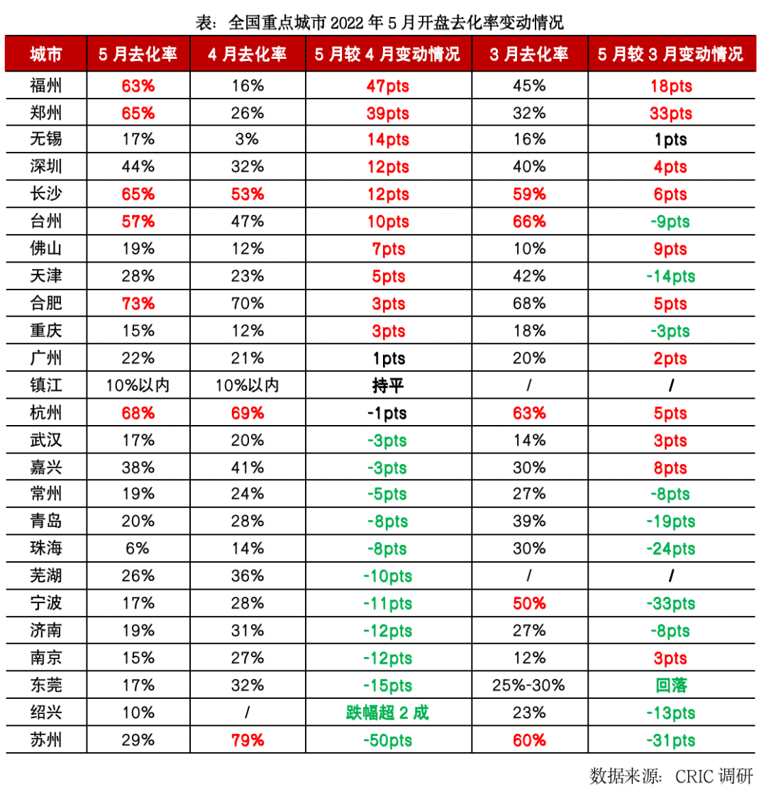 少數(shù)城市諸如無錫、佛山、重慶等也是源于上月基數(shù)較低的原因,出現(xiàn)了邊際復(fù)蘇跡象,不過三城5月去化率均不足20%,市場向好程度有限。