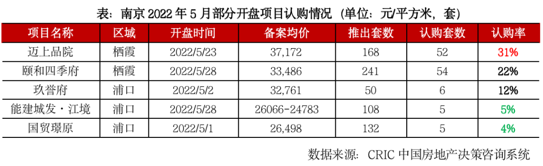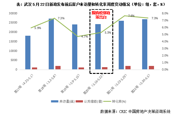 武漢5月限購也同樣存在松綁的現(xiàn)象,5月22日發(fā)布新政,針對投靠父母/子女的的本市戶籍居民家庭、多孩家庭、非本市戶籍首次置業(yè)家庭三類人群放開限購,同時(shí)連續(xù)兩次下調(diào)首套及二套商貸利率。從政策效果來看,來訪量穩(wěn)步回升,但客戶轉(zhuǎn)化率持穩(wěn)在7%-8%,多半客戶維持在交納認(rèn)籌金階段,刺激的效果尚且未顯現(xiàn)。以開盤去化情況來看,同樣印證了此觀點(diǎn),5月武漢新開盤以平推為主,整體去化率維持在17%,較4月微降3個(gè)百分點(diǎn),尚屬低位筑底階段。