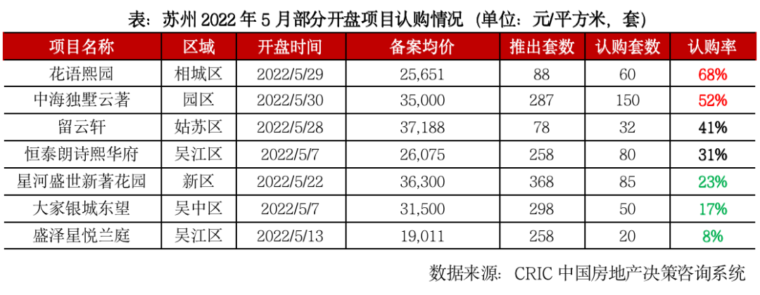 不過政策似乎并未在市場層面激蕩起太強(qiáng)的浪花,5月蘇州開盤去化延續(xù)低迷,7個(gè)項(xiàng)目開盤加推,一共推出1635套,開盤去化率僅29%,環(huán)比下降50個(gè)百分點(diǎn),由上月的結(jié)構(gòu)性上行回歸至新政前的低迷水平,僅相城太平板塊的花語熙園和園區(qū)車房板塊中海獨(dú)墅云著去化率均超過50%,其余項(xiàng)目多集中在32%以內(nèi)。