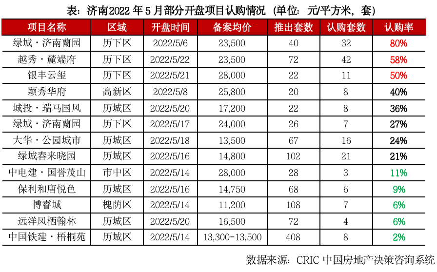 以濟(jì)南為例,5月在政策利好和疫情得以階段性控制的大背景下,客戶自然到訪及渠道來訪客戶上漲明顯。不過房企推盤積極性較低,多數(shù)項(xiàng)目以順銷為主,并未有集中蓄客,整體客戶基礎(chǔ)較差,因而濟(jì)南5月整體開盤去化率僅19%,較4月份(開盤去化率31%)下降12個(gè)百分點(diǎn)。僅個(gè)別區(qū)位佳、推盤量少(不足100套)的項(xiàng)目諸如綠城蘭園、銀豐云璽等去化率保持在50%以上。