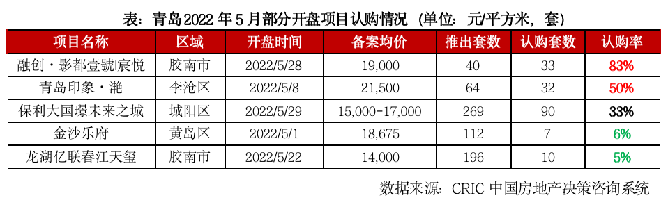 而從認(rèn)購情況來看,未見明顯增長,5月開盤去化率繼續(xù)走低,全月共計(jì)推售993套,去化202套,去化率僅為20%,較4月下降8個(gè)百分點(diǎn)。小批量開盤項(xiàng)目諸如融創(chuàng)·影都壹號(hào)|宸悅、青島印象·滟去化相對較好,認(rèn)購率達(dá)50%以上,而百套以上推盤項(xiàng)目相對去化慘淡,金沙樂府、龍湖億聯(lián)春江天璽等遠(yuǎn)郊片區(qū)項(xiàng)目去化率不足10%,由此可見,從到訪到購買行為兌現(xiàn)仍需一段時(shí)間。