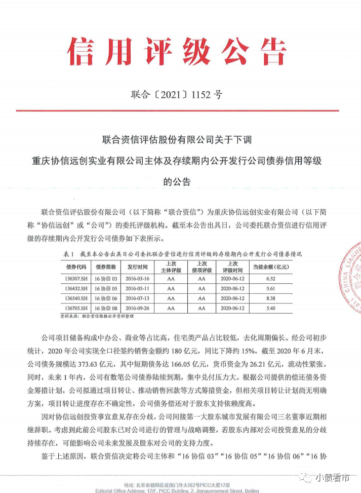 近日,聯合資信公告稱,將重慶協信遠創實業有限公司(以下簡稱“協信遠創”)主體和“16協信03”、“16協信05”、“16協信06”、“16協信08”信用等級下調至AA-,并將其列入可能下調信用等級的評級觀察名單。