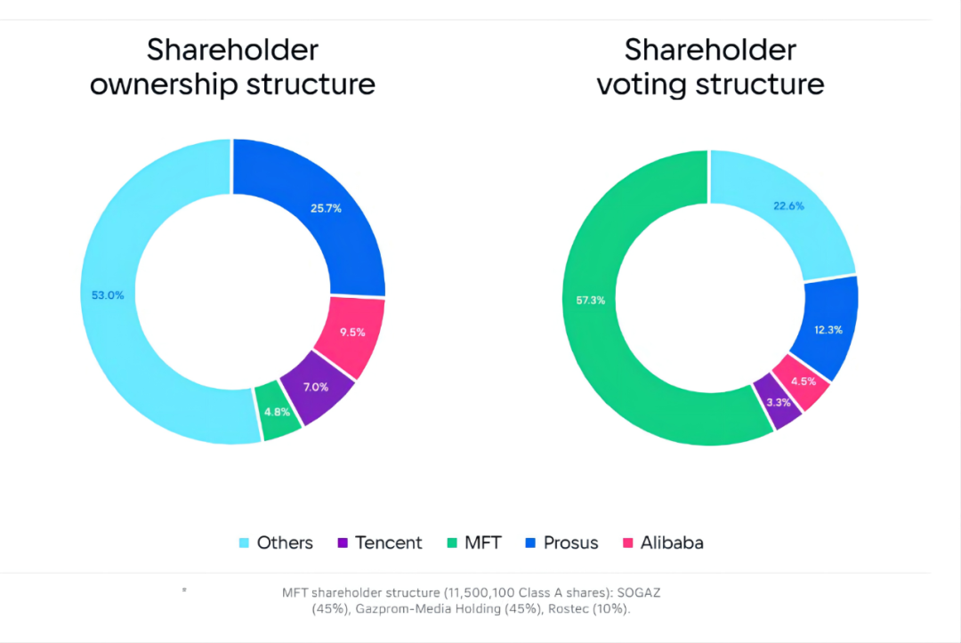 從股權結構上看,這家公司前三大股東是Naspers(也是騰訊的大股東)、阿里巴巴、騰訊。但控制權則屬于俄羅斯天然氣工業股份公司,俄羅斯國有控股企業。