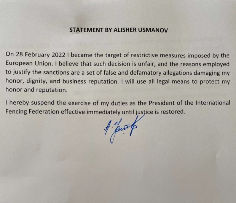 圖4:烏斯馬諾夫的聲明,來源:FIE官網