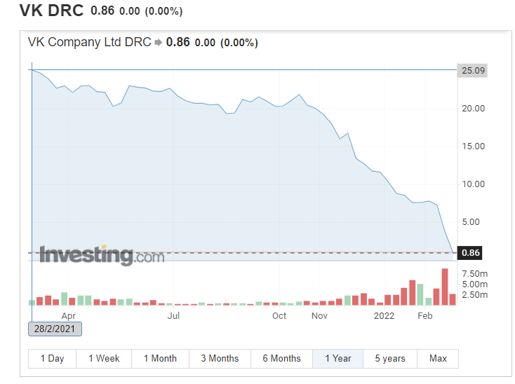 VK的股價已經從近一年來最高峰25美元以上跌至目前的0.86美元。