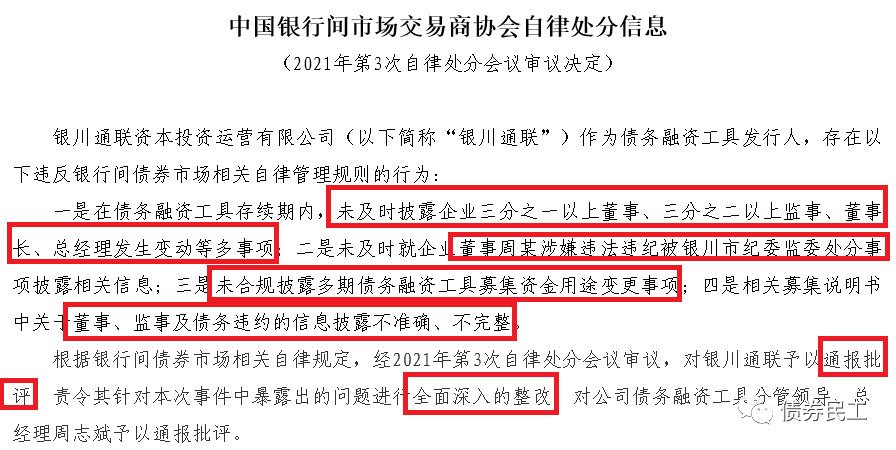 根據(jù)銀行間市場交易商協(xié)會網(wǎng)站的公開信息,銀川通聯(lián)資本投資運營有限公司(以下簡稱“銀川通聯(lián)資本”)因為未及時披露董監(jiān)高變動情況、董事被處分情況、募集資金用途變更情況等,被交易商協(xié)會處以通報批評的自律處分。