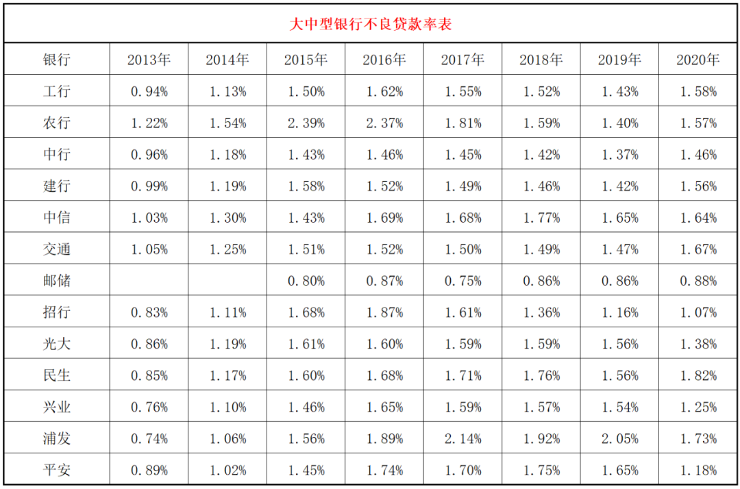 2、不良貸款率情況。由于經濟周期波動的原因,2013年平均不良貸款為0.93%,2016年為1.65%,2020年是1.45%。農業銀行因為歷史原因,2016年不良率很高,這幾年迅速下降,資產質量這幾年明顯改善。招商銀行2015-2016年主動暴露不良,大量出清對公業務,當時不良率僅次于歷史原因高企的農業銀行,后面幾年不良率大幅下降,從這個角度也可以看到招商銀行這幾年業績優異的一個原因。浦發銀行這幾年的不良率一直比較高,民生銀行2020年大核銷下不良率還繼續提升還是需要多給予關注。郵儲很多數據是神一般的存在,總感覺他們家和別的銀行還不在一個頻道上,總覺得沒有經過洗禮,還需要沉淀再看看。