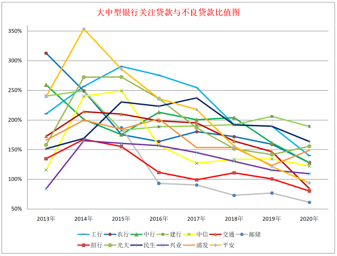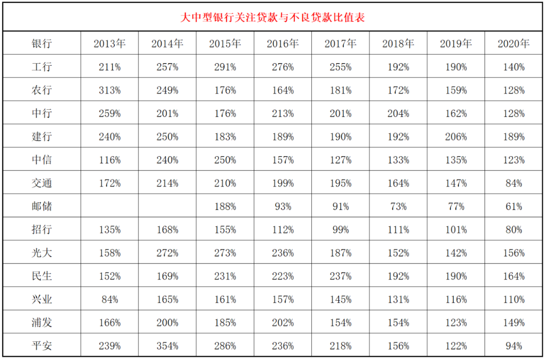 4、關注貸款與不良貸款比值情況。這是一個比較重要的數據,從五級分類角度看,關注貸款與不良貸款比值越小,說明不良貸款的認定越嚴格。從整個情況看,這個比值一直在下滑,2014年平均為230%,2015年為215%,2016年為189%,2017年為175%,2018年為156%,2019年為144%,2020年為124%,這說明銀行業這些年整體認定標準要是越來越嚴格。郵儲銀行、招商銀行、交通銀行、平安銀行低于100%,建設銀行、民生銀行、光大銀行的數據偏大一些。