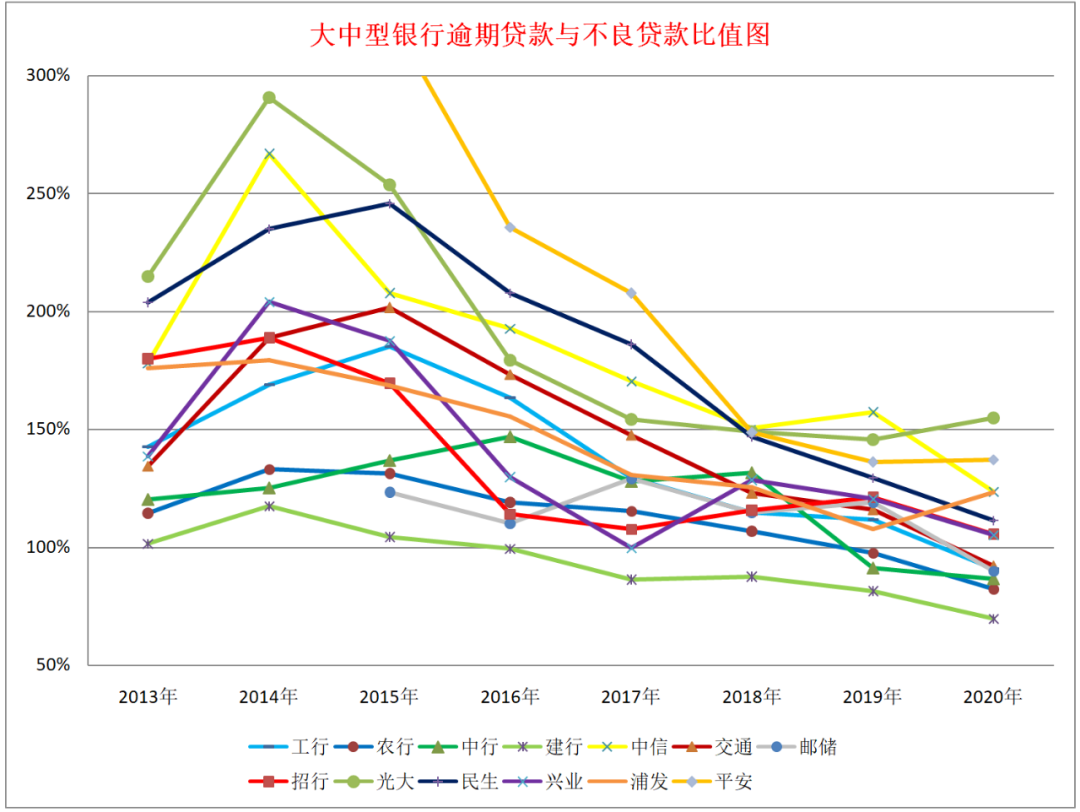 1、總體規律。十年前銀行的不良率是很低的,然后不良貸款率一直攀升,2015-2017年達到峰值,2018-2019年總體下降,疫情影響2020年有所抬頭,2021年大概率會繼續往下。關注貸款從數據看確實是不良貸款的先行指標,關注貸款是在2014-2015年達到峰值,總體看比不良要早一些。在逾期貸款、逾期90天以上貸款與不良貸款的比值上,總體上是不斷下降的,也就是對資產質量認定的標準是越來越嚴格。