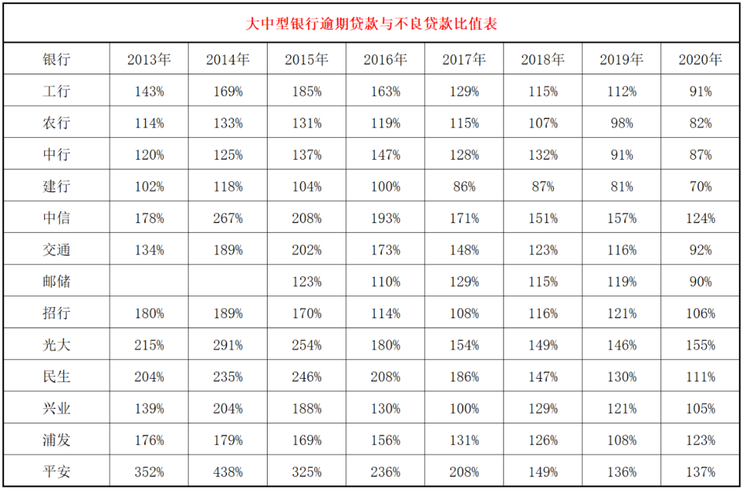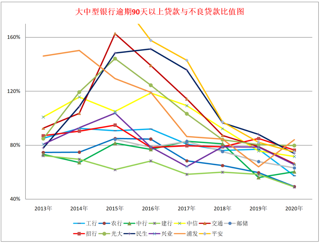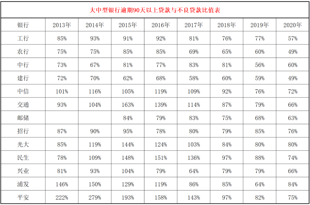 6、逾期90天以上貸款與不良貸款比值情況。我個人認為這是本文最重要的數據,如果說短期逾期統計上可能會有誤差,那么逾期90天以上就無論如何都跑不掉。在過去的很多年,很多朋友都認為,逾期90天以上貸款才是真正的不良貸款,這個數據更加科學合理,更加標準化,更加具有可比性。原來很多銀行逾期90天以上貸款超過不良貸款,后來銀保監會發文明確要求逾期90天以上貸款必須納入不良。這個指標如果作為不良貸款的替代,可以衍生出很多其他指標,比如逾期90天以上覆蓋率等。從數據看,目前所有的銀行都已經將90天以上逾期貸款納入不良,2020年平均為67%,也就是還有33%的不良貸款是沒有逾期90天以上的。這里表現最優秀的是建設銀行和農業銀行,他們這個比值都是49%,這說明不良貸款的一半是沒有逾期90天以上的,如果算逾期90天以上貸款覆蓋率,那么他們現有的覆蓋率都需要翻倍。這個數據表現弱一點的是光大銀行、招商銀行和民生銀行,分別為80%,76%和74%,這說明這三家銀行在認定資產質量方面要弱一些。