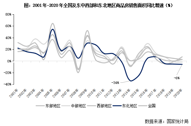 1、東北銷售面積增速自2010年來急跌緩增,2018年起連續3年負增長