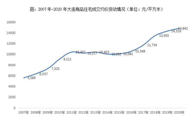 房價層面,大連商品住宅成交均價呈現出“階梯性”爬升特點:2017-2011年逐年遞增至房價破萬,2012-2016年高位持穩,并無太大波動,甚至出現小幅微降趨勢,2017年開始進入新一輪爬升,2020年再度達到階段性高點,商品住宅成交均價高位維持在14842元/平方米。