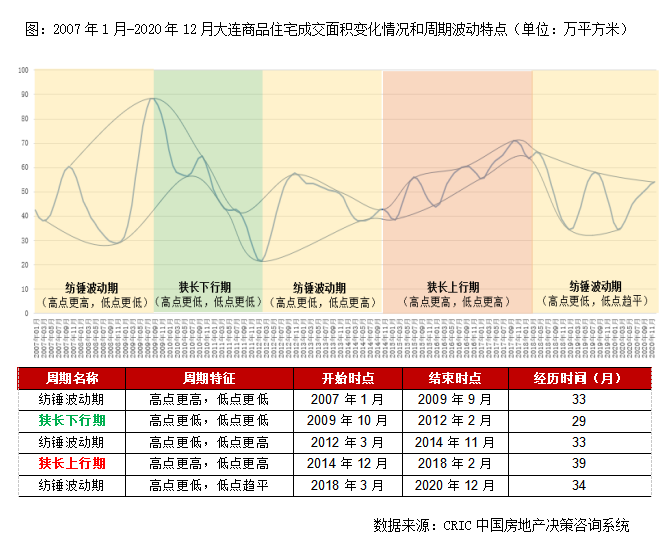 大連市場發展總體可分為兩個階段,2011年之前為“大漲大跌”的劇烈波動期,2012年之后高位持穩,波動加劇,波幅減小。而細化到月度數據,可以看出大連成交變動每一個波段周期基本都持續在30-40個月之間,即3年為一周期,紡錘波動期和狹長上&下行周期緊密相連。