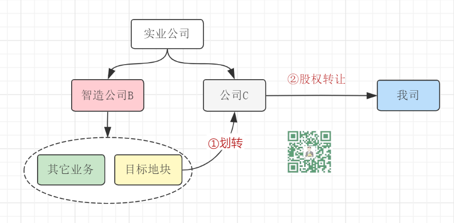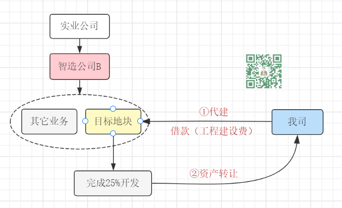 ▲實(shí)操中——在劃轉(zhuǎn)過(guò)程中圍繞著目標(biāo)公司本身的主營(yíng)來(lái)操作(大部分都為實(shí)業(yè)公司),由此達(dá)到免征土地增值稅的效果。未來(lái)再申請(qǐng)房產(chǎn)開(kāi)發(fā)資質(zhì),并更經(jīng)營(yíng)范圍,前期則通過(guò)代建模式先行開(kāi)發(fā)。