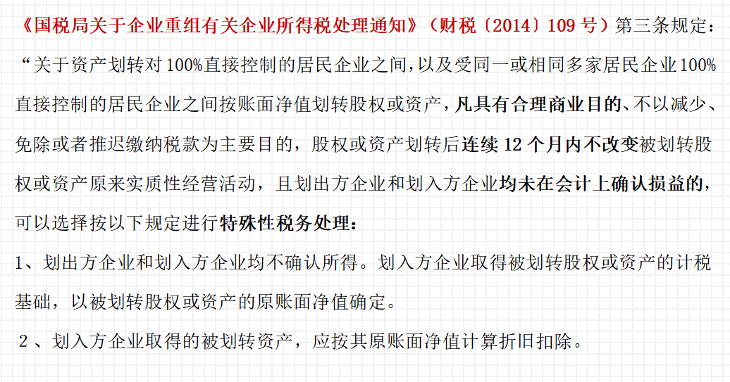 (財(cái)稅〔2014〕109號(hào))明確了資產(chǎn)劃轉(zhuǎn)情形下的所得稅的稅務(wù)處理分為一般性稅務(wù)處理、特殊性稅務(wù)處理兩種方式。