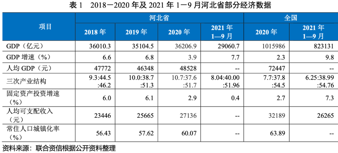 河北省經濟發展基礎較好,經濟總量在全國排名中游,但人均地區生產總值在全國排名靠后。受鋼鐵、煤炭、石化等傳統支柱產業化解過剩產能及節能減排等政策影響,經濟增長面臨一定壓力。2021年前三季度,河北省各主要經濟指標保持增長,但增速不及全國平均水平。