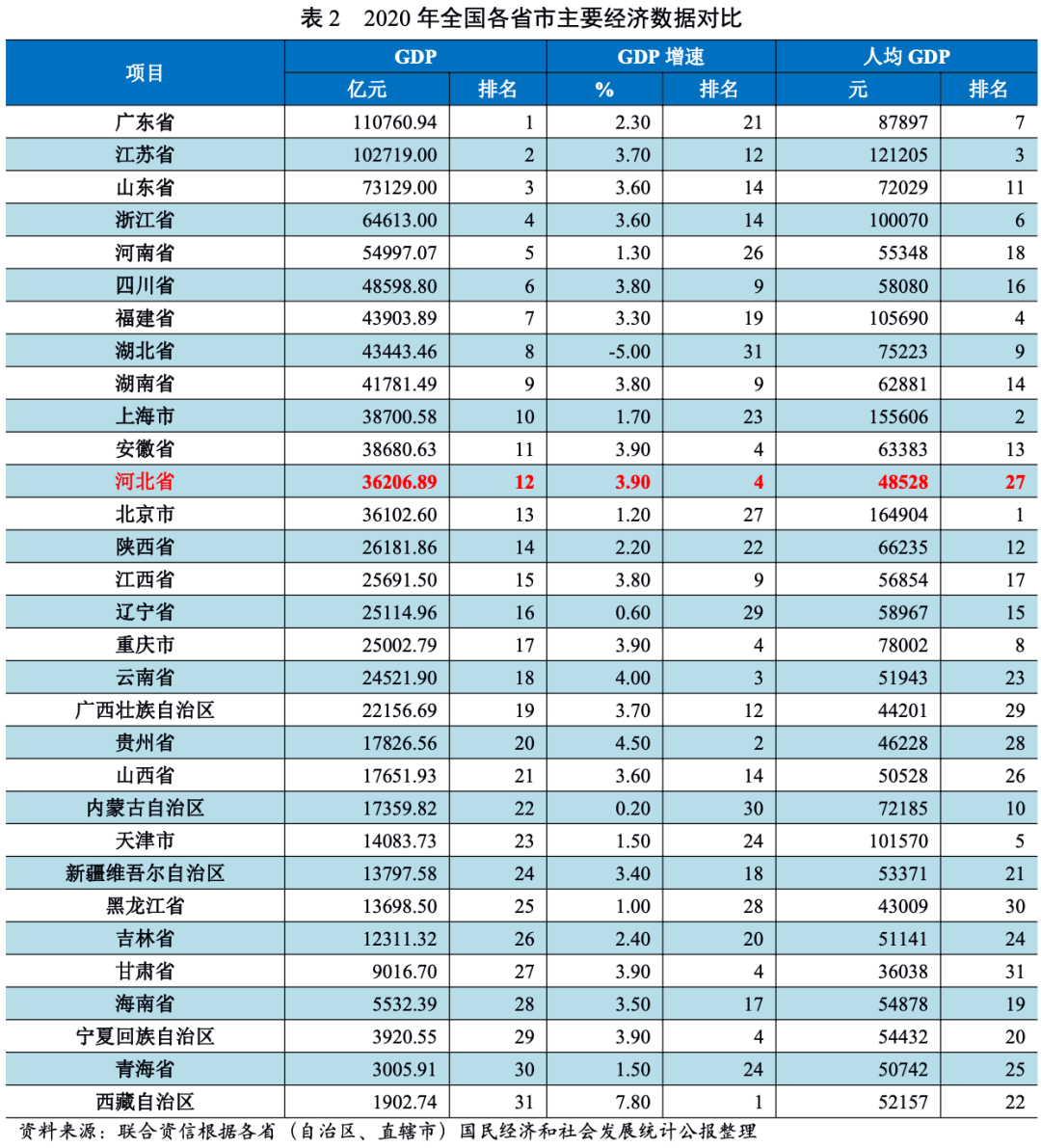 從GDP增速看,2020年河北省各地級市GDP增速均介于3.5%~4.5%之間,差距不大。各地級市人均GDP差異較大,其中最高為唐山市,其后依次為廊坊市、秦皇島市、石家莊市、滄州市和承德市,人均GDP在4.50~6.10萬元之間,剩余地級市人均GDP均在4.00萬元以下,邢臺市人均GDP水平最低,僅為3.09萬元。