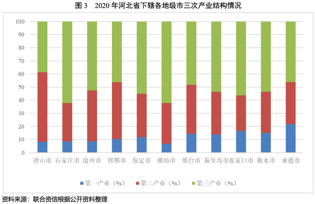 從產業結構看,近年河北省下轄各地級市第三產業均保持較快發展,對經濟增長的拉動作用日益顯著。石家莊市、滄州市、邯鄲市、保定市、廊坊市、邢臺市、秦皇島市、張家口市和衡水市產業結構以第三產業為主,其中石家莊市和廊坊市第三產業比重超過60%;唐山市是河北省唯一一個經濟結構以工業為主的地級市,第二產業占比超過50%;第一產業比重較高的地市主要系承德市,第一產業占比超過20%。
