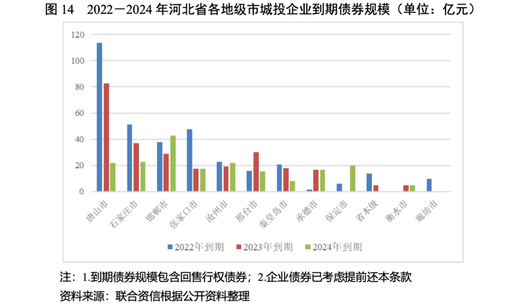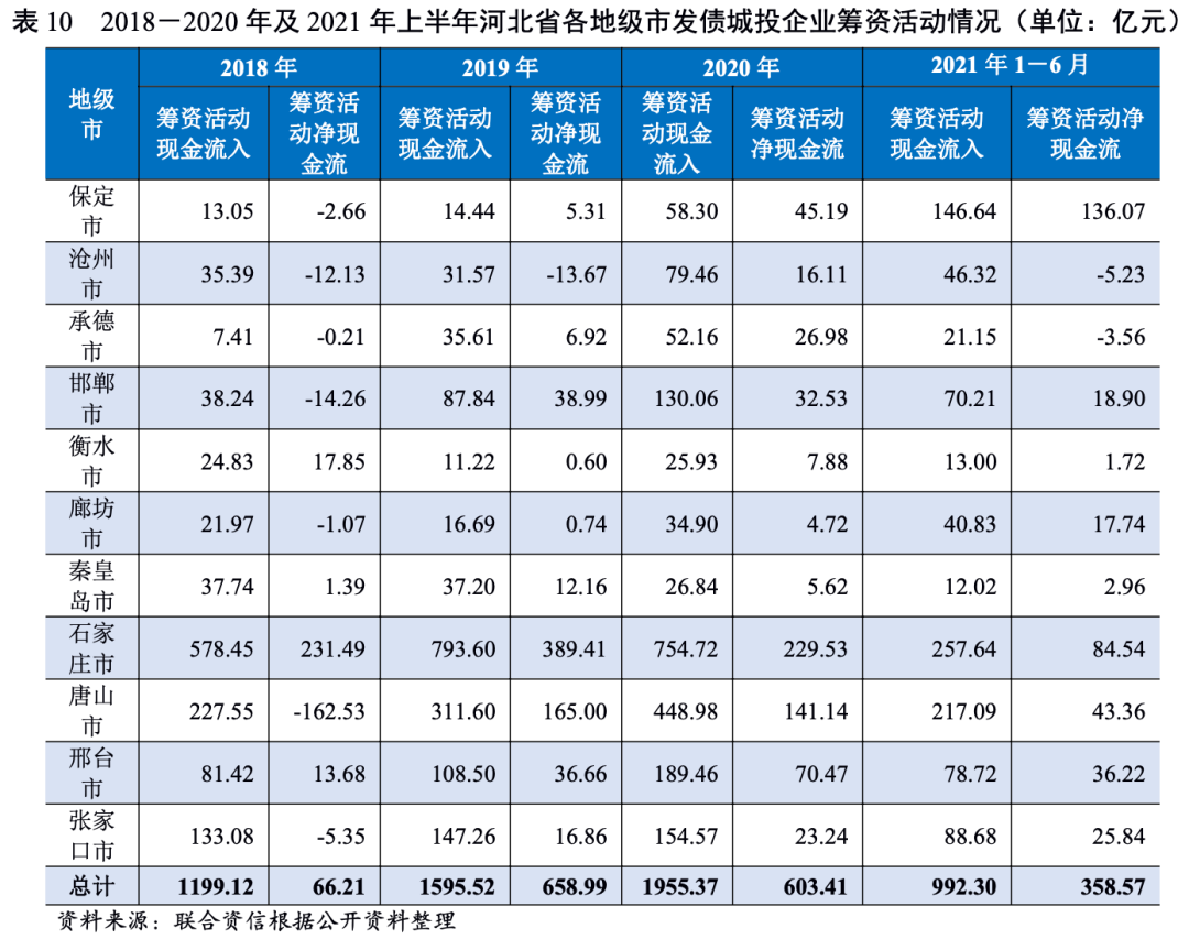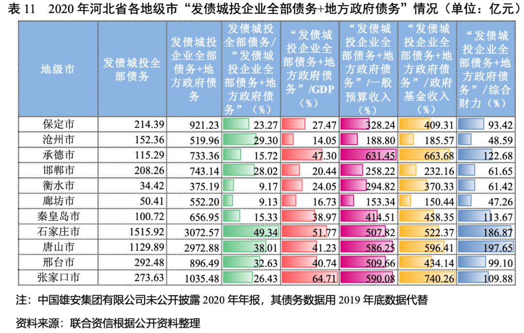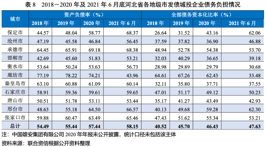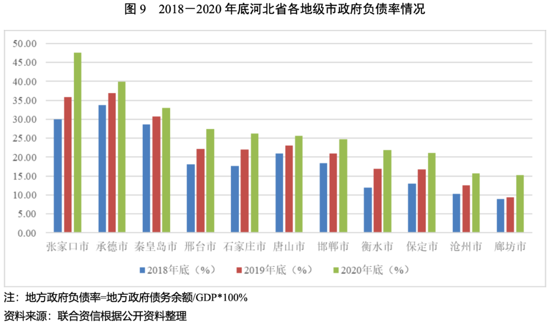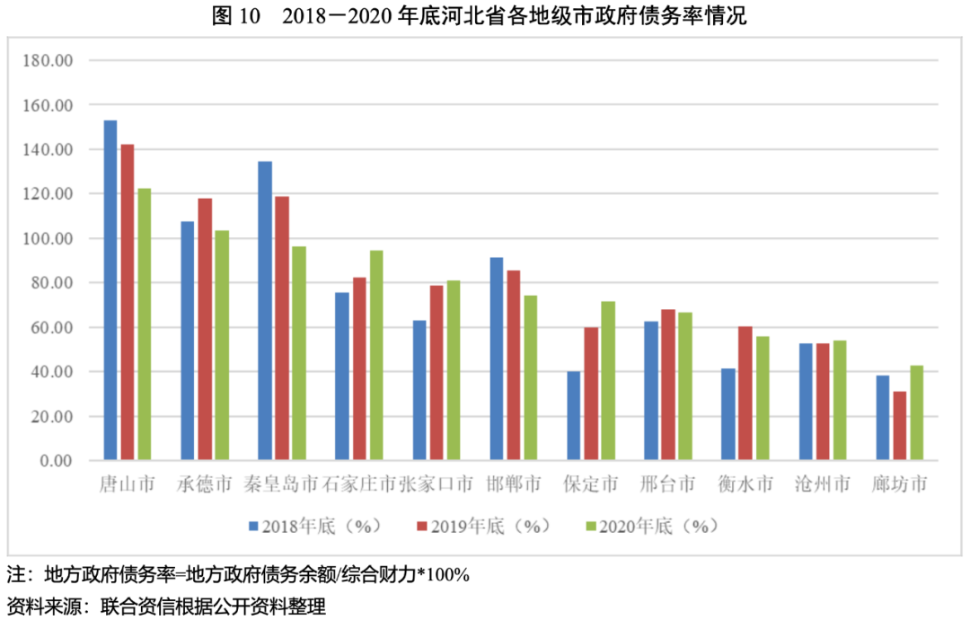 2020年,河北省發債城投企業債務負擔進一步加重,其中張家口市、邢臺市、保定市和承德市的發債城投企業債務負擔較重,唐山市的發債城投企業未來三年到期債券規模較大,秦皇島市、滄州市、唐山市的短期償債壓力相對較大。