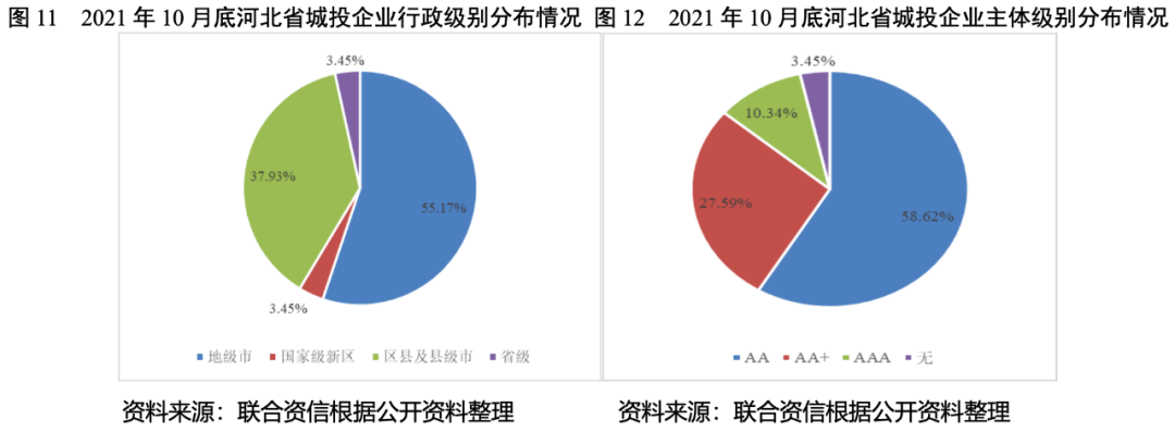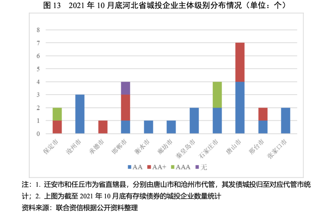 截至2021年10月底,河北省有存續債的城投企業共29家,其中省級城投企業1家,市級城投企業16家,區縣級城投企業11家,國家級新區城投企業1家。河北省下轄11個地級市均有發債城投企業[1],其中,唐山市7家,石家莊市4家,邯鄲市4家,滄州市3家,保定市、邢臺市、秦皇島市和張家口市各2家,承德市、衡水市和廊坊市各1家。