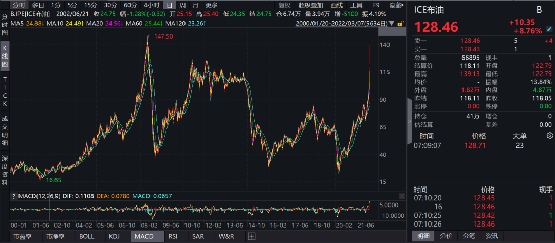受此影響,國際油價大漲,美、布期貨開盤漲10%。其中一度升至135美元/桶,WTI期貨突破130美元/桶。