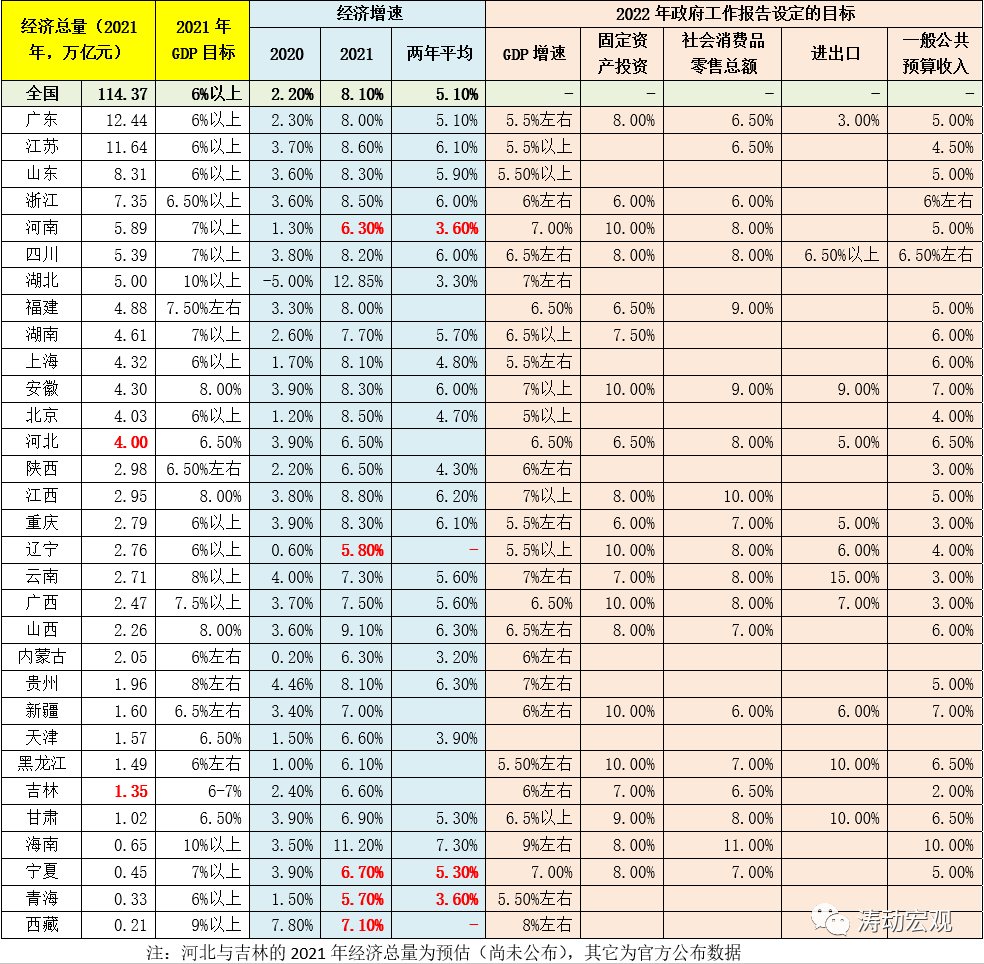 就2022年經濟增速目標設定來說,只有河南與西藏的2022年經濟增速目標(分別為7%左右和8%左右)高于2021年實際經濟增速(6.30%和7%左右)。其中,河南有點像2021年的湖北,即2021年受疫情和洪澇災害影響的河南想著在2022年要扳回一城。西藏則是因為2021年實際經濟增速較目標差了兩個百分點,2022年需要補回來。