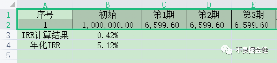 這種其實小貸或者網貸比較多,同樣是創建一個表格,輸入對應的現金流,同樣是12期都要輸入哦。在B5位置輸入公式=IRR(B4:N4),在B6位置輸入公式=(1+B5)^12-1。這里和上面不一樣的是金融機構支出10萬的時候當期有一筆1000元的進賬,實際支出只有99000元。