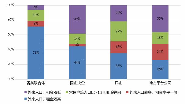 而地方平臺公司拿地一般以“托底”為主,而外來人口、租金雙低的城市更需要托底,因此占比最高,達到36%,與此同時地方平臺公司在外來人口和租金雙高的城市持有租賃用地的比例在各類型企業中最低??梢姷胤狡脚_公司拿地的對盈利性的要求相對較低,主要是為保證地方租賃用地供應計劃的完成。