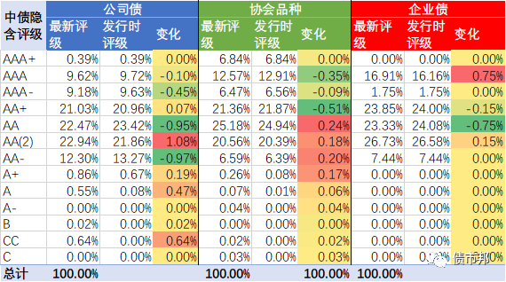 我們來看看,2021年發(fā)行的三大信用債品種(剔除SCP)的最新的隱含評級分布,以及與發(fā)行時候隱含評級變化的情況。