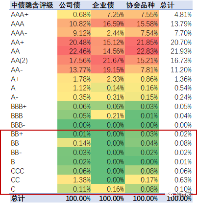 協(xié)會品種方面,AAA、AAA-和AA+的占比下滑了0.95%,而AA、AA(2)等較低隱含評級的占比顯著提升;