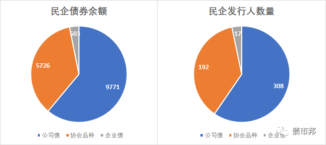 從存量上來看,民企發(fā)行人的數(shù)量是公司債(308家)>協(xié)會品種(192家)>企業(yè)債(17家);民企債券余額是公司債(9771億元)>協(xié)會品種(5726億元)>企業(yè)債(503億元)。