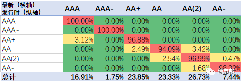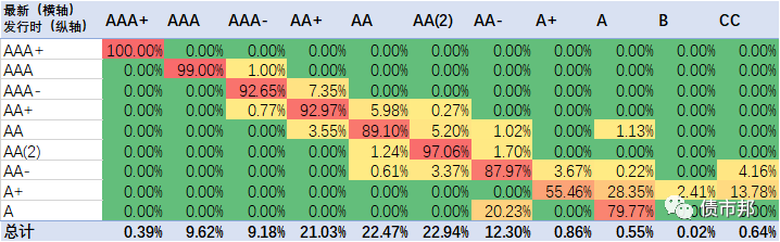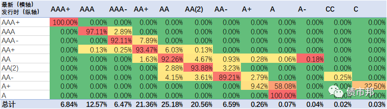 下面是2021年公司債券的隱含評級遷徙情況,橫軸為最新隱含評級情況,縱軸為發(fā)行時的隱含評級。