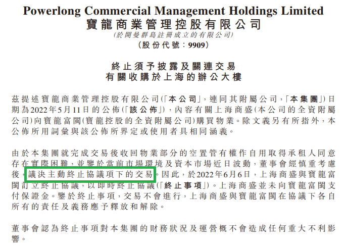 由于集團(tuán)就完成交易后收回物業(yè)部分的空置管有權(quán)作自用取得承租人同意存在實(shí)際困難,并鑒于當(dāng)前市場(chǎng)環(huán)境及資本市場(chǎng)近日波動(dòng),董事會(huì)經(jīng)慎重考慮后,議決主動(dòng)終止協(xié)議項(xiàng)下的交易。因此,于2022年6月6日,公司子公司上海商盛與寶龍控股子公司寶龍富閩訂立終止協(xié)議,以即時(shí)終止協(xié)議。上海商盛并未向?qū)汖埜婚}支付保證金。鑒于終止事項(xiàng),交易不會(huì)進(jìn)行,上海商盛與寶龍富閩在協(xié)議下各自所有的責(zé)任及義務(wù)應(yīng)予釋放和解除。
