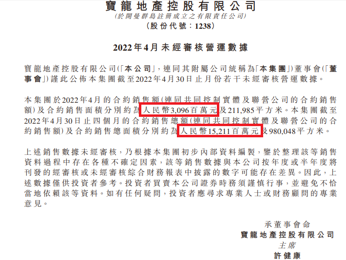 根據(jù)2022年4月寶龍地產(chǎn)的未經(jīng)審核營運(yùn)數(shù)據(jù),當(dāng)月寶龍地產(chǎn)合約銷售額30.96億元,前4月合約銷售為152.11億元。