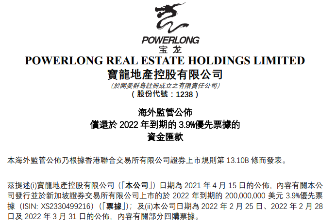 2022年4月初,杠桿地產(chǎn)注意到,寶龍地產(chǎn)曾發(fā)布一則公告,“海外監(jiān)管公布償還于2022年到期的3.9%優(yōu)先票據(jù)的資金匯款”。