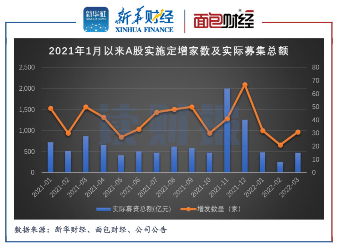 圖1:2021年1月以來A股實(shí)施定增家數(shù)及實(shí)際募集總額