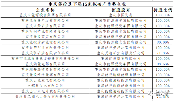 據(jù)報(bào)道,重慶能源集團(tuán)等16家企業(yè)申請(qǐng)破產(chǎn)重整,經(jīng)查詢(xún),除重慶能投外,其他15家公司均為重慶能投控股子公司。從相關(guān)信息來(lái)看,本次破產(chǎn)重整似乎早有計(jì)劃。