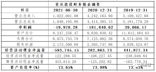 從公開(kāi)披露信息來(lái)看,重慶能投最近兩年一期為2019年至2021年半年報(bào),其主營(yíng)業(yè)務(wù)收入呈現(xiàn)下滑趨勢(shì),凈利潤(rùn)則大幅下降,并出較大幅度的虧損;經(jīng)營(yíng)活動(dòng)現(xiàn)金凈流量處于不斷下降,甚至惡化的狀態(tài);而資產(chǎn)負(fù)債率則相對(duì)平穩(wěn),但是負(fù)債率較高,接近74%,總體來(lái)看財(cái)務(wù)情況并不理想。