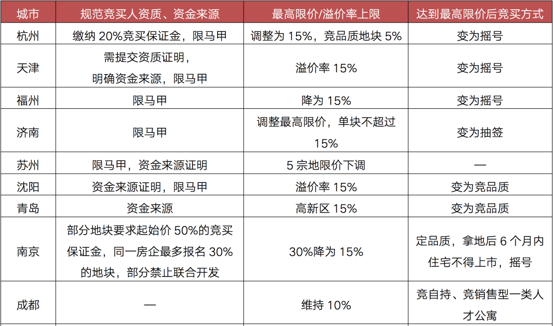 基于此,8月10日自然資源部召開閉門會(huì)議,要求集中供地城市優(yōu)化第二批次土地出讓政策,隨后,各大城市臨時(shí)中止土拍,紛紛調(diào)整土拍規(guī)則,只要涉及三大方面: